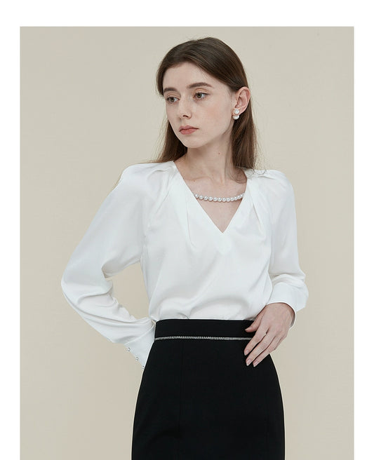 【CAROLINE】Vネックパールチェーンハイエンドシフォンシャツ
